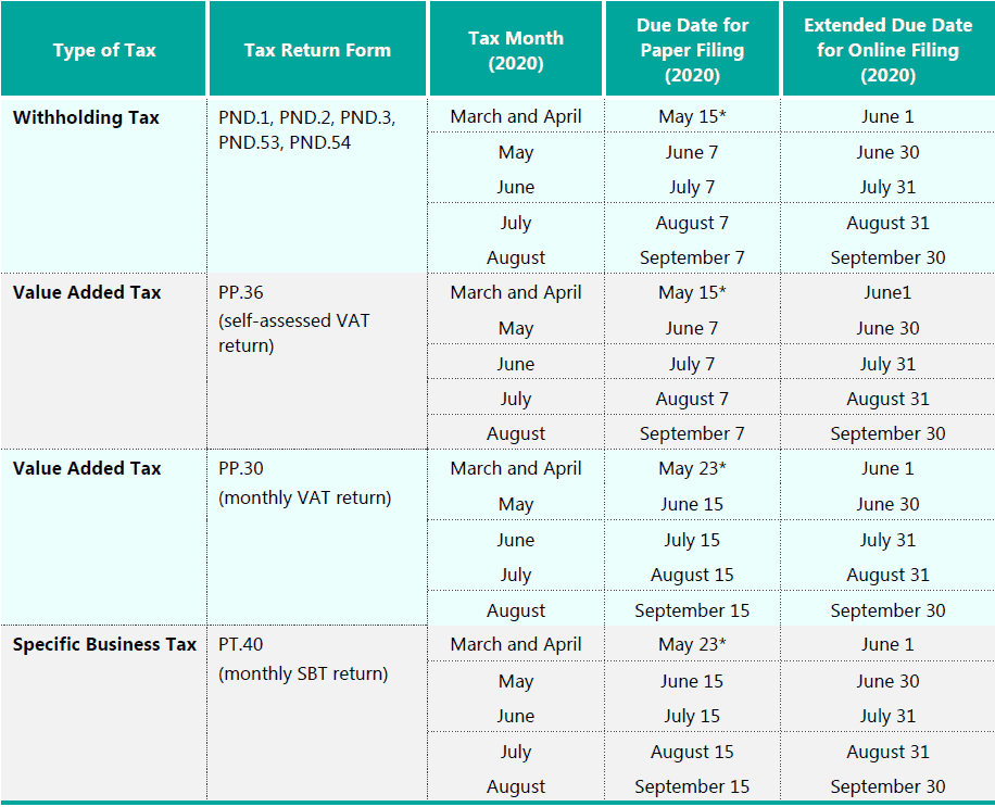 *The normal due date has been extended under the Notification of the Ministry of Finance Re: Extension of Period for Tax Return Submissions and Remittance or Payment of Taxes and Duties for Persons Liable to Remit Withholding Tax, Persons Liable to Remit Corporate Income Tax, Remittance or Payment of Value Added Tax, Payment of Specific Business Tax, and Payment of Stamp Duty (No.2) dated April 3, 2020.