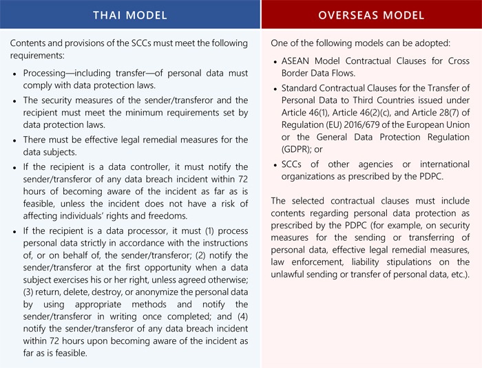 • Standard contractual clauses (SCCs) that serve as foundational frameworks for establishing legal agreements, especially in the context of cross-border data transfers. In this regard, Thailand currently accepts two distinct SCC models, the Thai Model and the Overseas Model. The specific provisions and applications of each model—either of which can be adopted, as appropriate—are summarized in the table below.